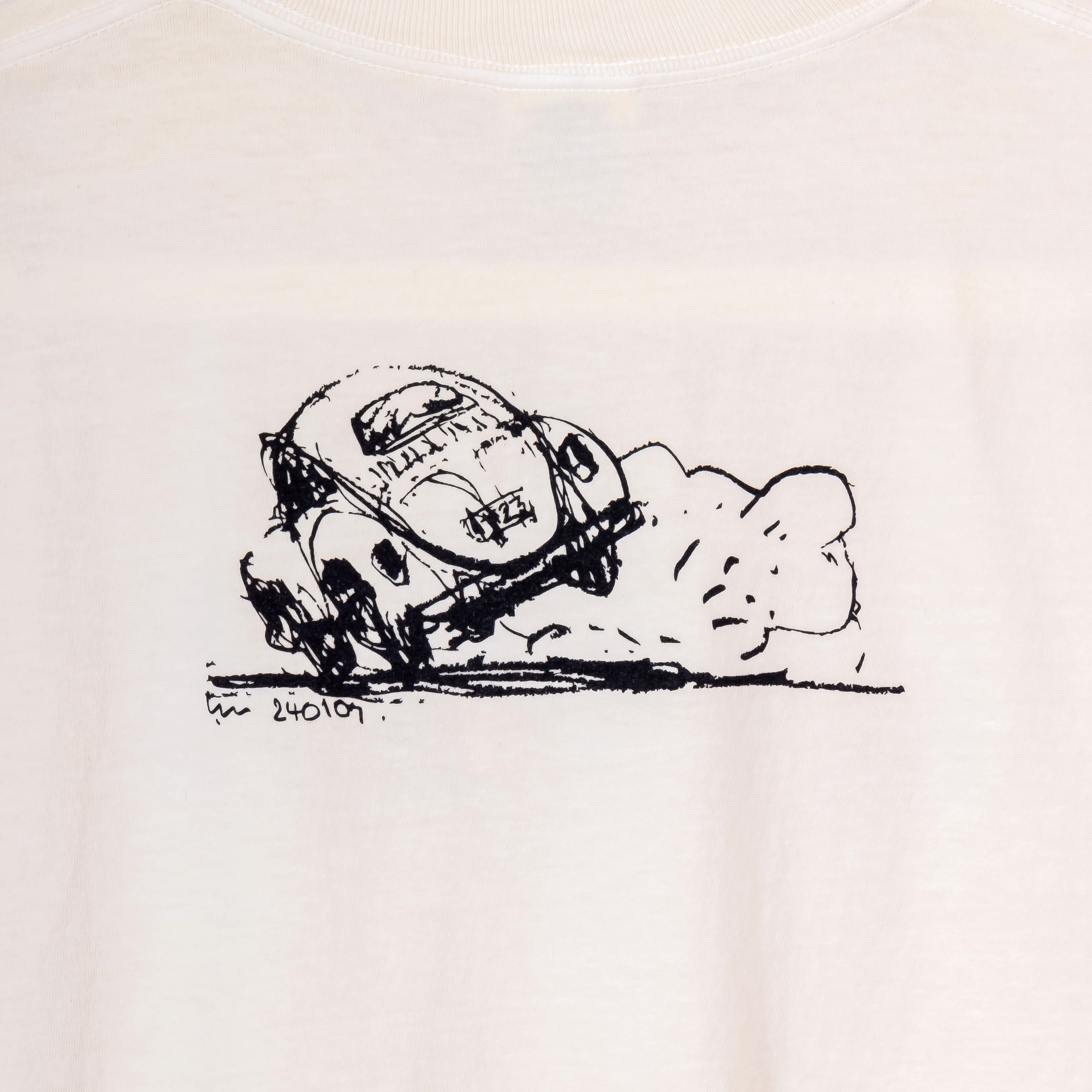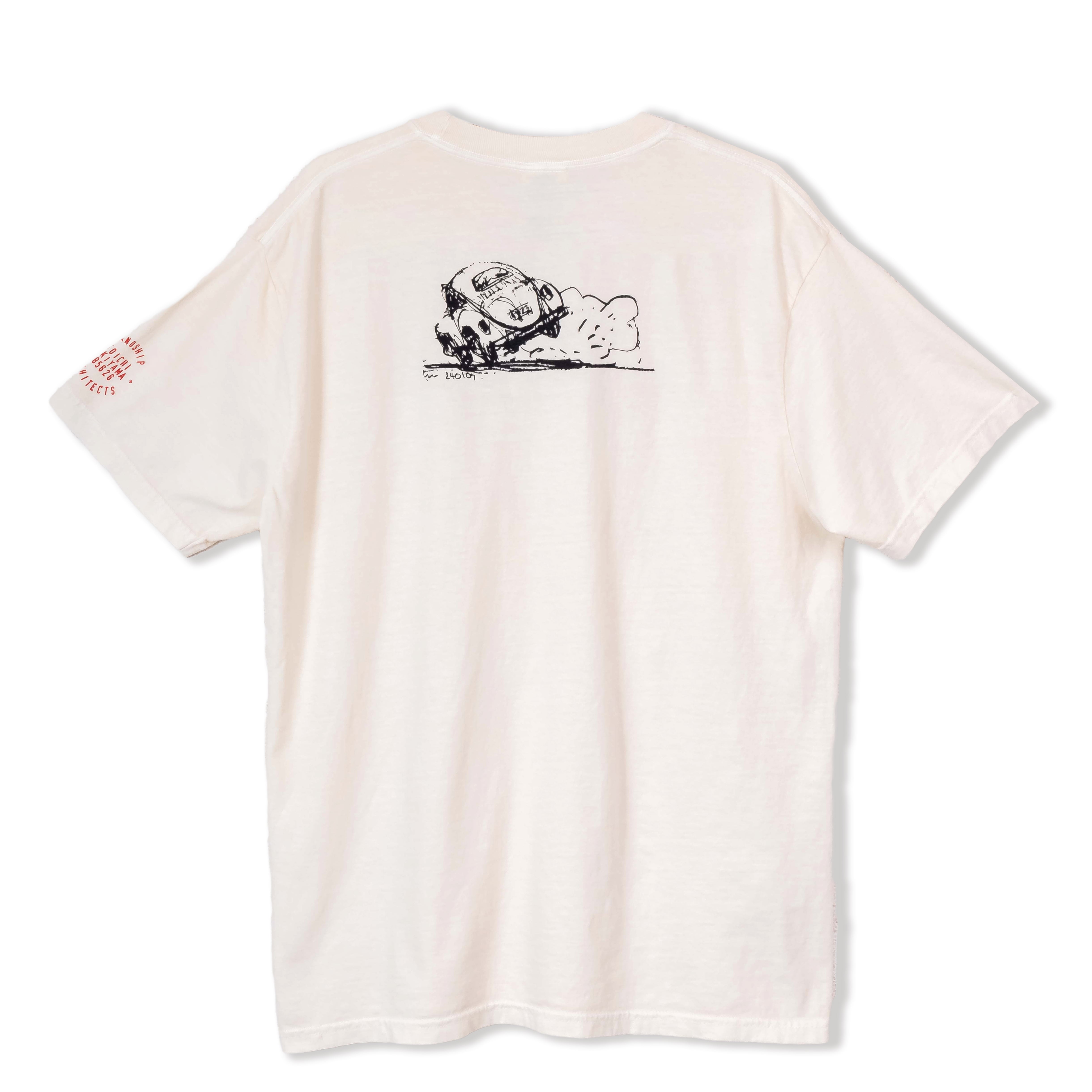 フロントは印象的なロゴデザイン、袖には秋山が愛用していたスタンプをプリント、そして、バックには秋山東一が描いたVolkswagen Beetleのラフなタッチのアートワークを配置しています。
